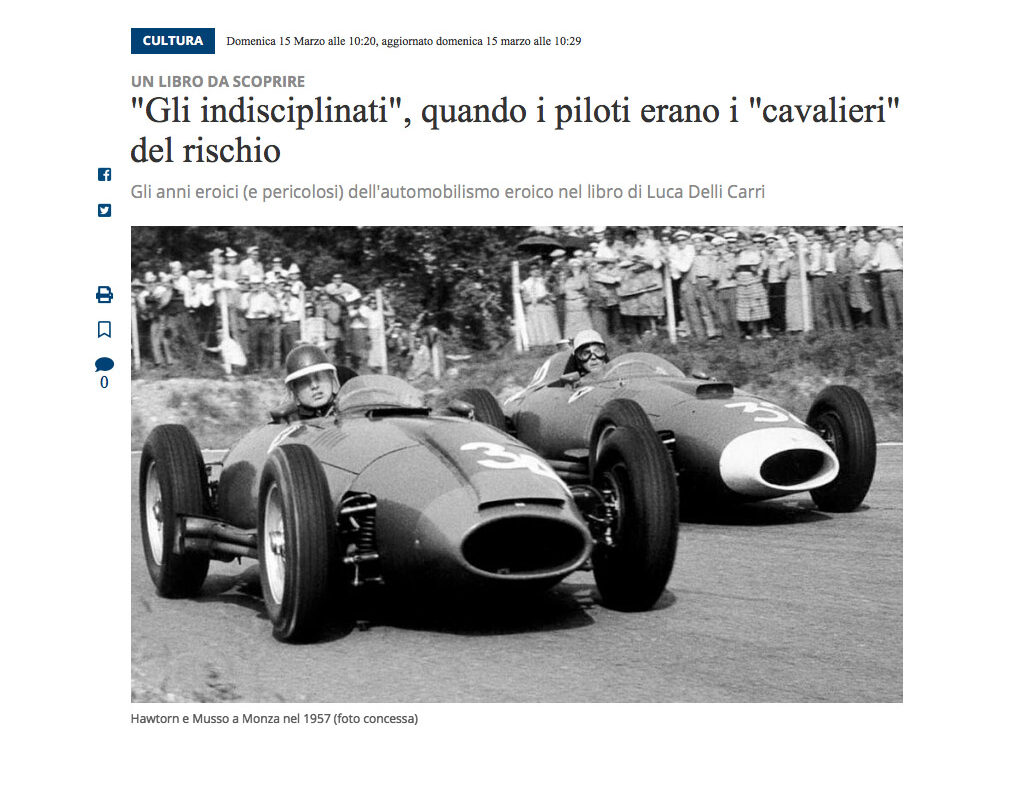 Proprio perché così avventuroso e rischioso quell’automobilismo oggi può essere raccontato come un vero e proprio romanzo. Lo dimostra il giornalista Luca Delli Carri nel suo Gli indisciplinati (Fucina, 2019, pp. 560), in cui vengono rievocate le vicende dei cinque giovani piloti che corsero per la Ferrari tra il 1956 e il 1959: Eugenio Castellotti, Alfonso Portago, Luigi Musso, Peter Collins, Mike Hawthorn. Erano tutti campioni e tutti avevano un sogno: vincere. Erano spavaldi, incoscienti e snobbavano la paura. Erano idolatrati dai tifosi e accompagnati da donne bellissime: attrici, star dello spettacolo e della nascente televisione. Nel giro di tre anni bruciarono la loro vita spingendo i loro limiti sempre più all’estremo e perdendo la vita alla guida di un’auto da corsa. Ma perché definirli “indisciplinati”? Lo chiediamo all’autore del libro, Luca Delli Carri: “Erano indisciplinati perché erano molto lontani dal prototipo di pilota superprofessionista che c’è oggi. Ne combinavano di tutti i colori con le loro automobili. Se non gli andava di correre rompevano apposta la macchina oppure si giocavano i premi delle gare che non avevano ancora disputato a carte così che poi dovevano spingere oltre il limite per avere i soldi per pagare i debiti. Insomma, erano degli scapestrati che però accendevano la passione come oggi non accade più. Soprattutto erano ragazzi molto ambiziosi. Correvano con il sogno di rimpiazzare il più grande campione dell’epoca, l’argentino Juan Manuel Fangio, plurivincitore di titoli mondiali, nel cuore della gente e soprattutto in quello di Enzo Ferrari. E per quel sogno erano disposti a correre ogni rischio”.